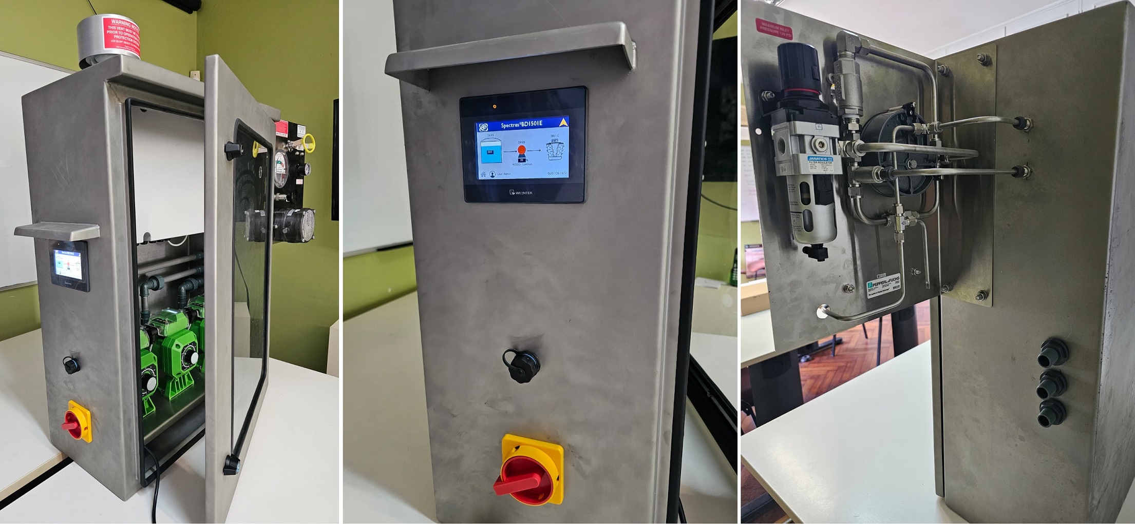El sistema cuenta con un HMI integrado, desde donde se supervisa el proceso completo: operación de bombas, ajustes de modos de dosificación y visualización gráfica de parámetros y niveles de producto en los IBC.